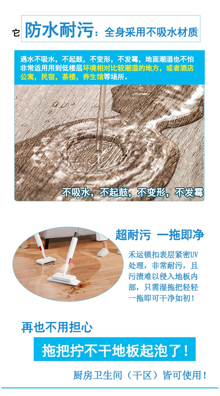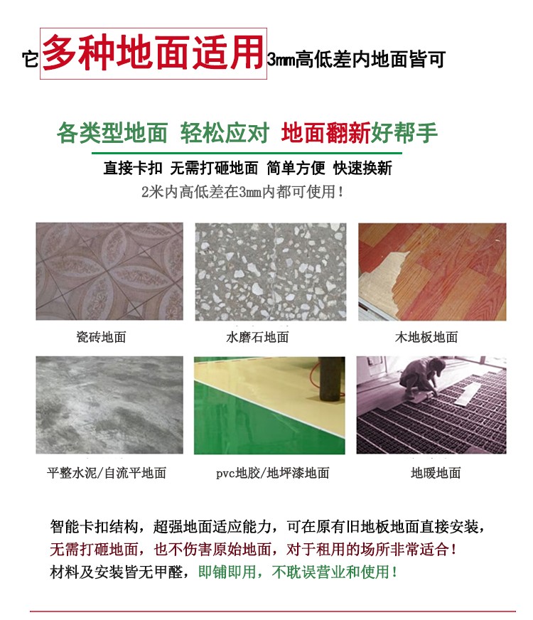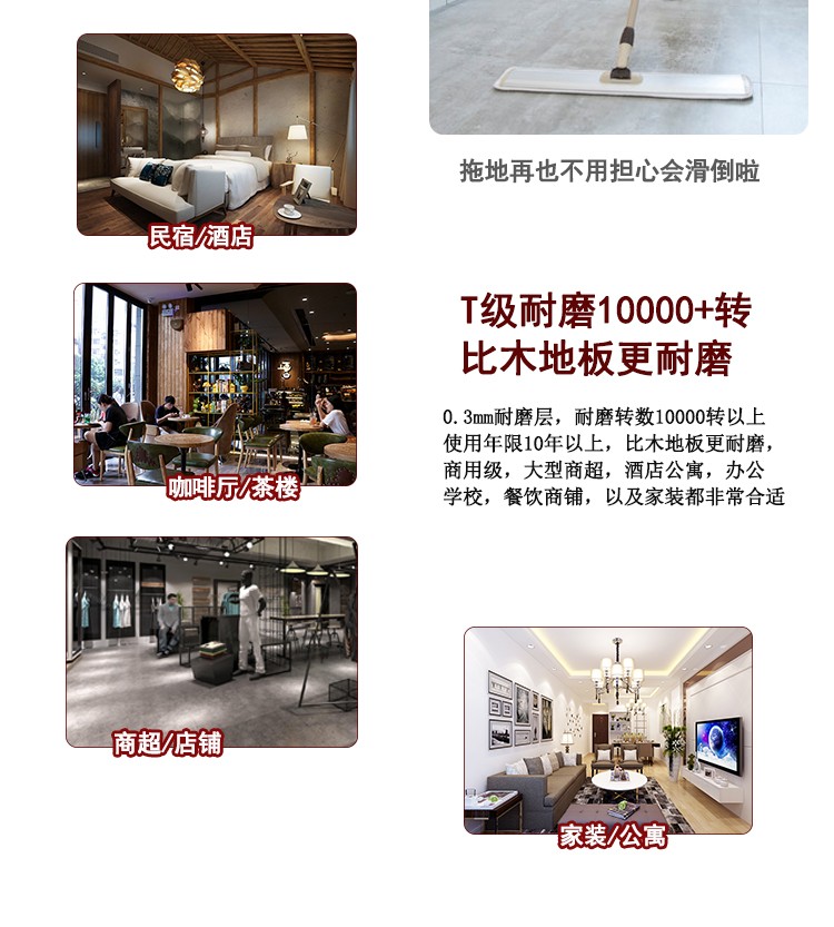 介紹:spc鎖扣石塑地板,是由鈣粉、聚氯乙烯穩(wěn)定劑組合的一定比例混合形成復(fù)合地鋪材料。是現(xiàn)在非常流行的一種無(wú)醛環(huán)保地板,極為穩(wěn)定、高性能、完全防水、高密度銷售芯、耐壓痕;它可以很容易地安裝在不同類型的地面基地,混凝土,陶瓷或現(xiàn)有的地板,非常適合用于舊地面改造,老舊瓷磚木地板地毯等地面翻新使用。安裝快速簡(jiǎn)單,材料環(huán)保無(wú)味,即鋪即用。是響應(yīng)國(guó)家減排而發(fā)明的新型材料,是100%不含甲醛的環(huán)保地板,是真正的0甲醛地板。因其厚度薄、花色多、款式全、低碳環(huán)保的性能可廣泛應(yīng)用于幼兒園、醫(yī)院、辦公室、寫字樓、商場(chǎng)、家居、酒店、公寓、別墅、KTV等公眾場(chǎng)所。